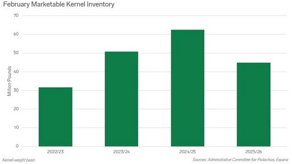 Estimated marketable kernel inventory at the end of February was 44.8 million pounds gross kernel weight, or 99.5 million pounds in-shell equivalent. This is down 28.2% from February 2025 and 11.7% below February 2024 levels. These figures reflect the ACP classification of inventory available for potential sale and do not account for forward sales commitments. Industry sources indicate that actual availability in the spot market is tighter, as part of the inventory is already committed through contracts.