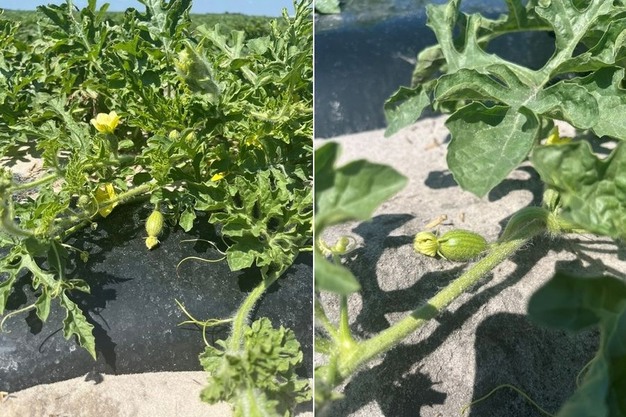 Left: Styrofoam cups were put around watermelon plants to protect them from the freeze. Right: the fruit is developing nicely.