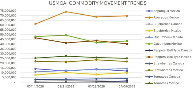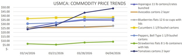 Movement from Mexico through Texas is steady, with light supplies and active trading. Prices are higher, with vine-ripened 4x4–4x5s mostly US$56.95–58.95. Nogales' supply is very light, with strong price increases. Freight rates and limited truck availability continue to affect pricing.