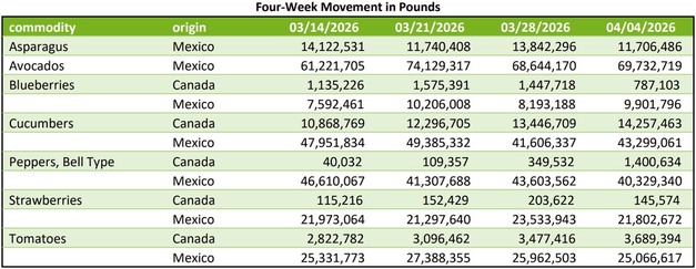 Movement from Mexico through Calexico, California, and San Luis, Arizona, is expected to decrease as harvest transitions to Baja. Supplies are in too few hands to establish a market. Harvest in Walla Walla and Lower Yakima Valley, Washington, is expected to begin the week of April 12. Quality is expected to be generally good.