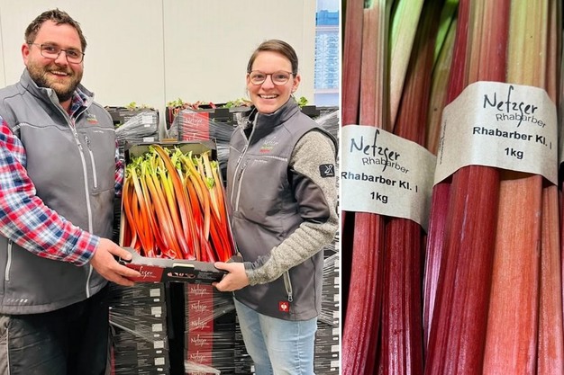 Peter Nefzger and his wife have been dedicated to rhubarb cultivation for five years now. Bundled rhubarb in 750 g and 1.5 kg packages is enjoying increasing popularity in retail stores.