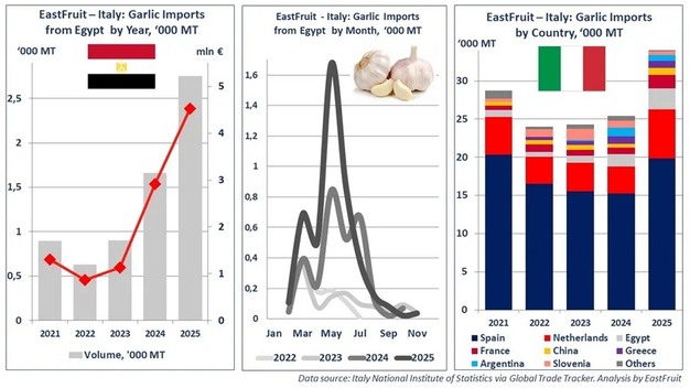 Egypt has expanded its position in Italy's garlic market, with exports increasing by 55 per cent in 2025 to a record level, according to EastFruit. Data from Italy's National Institute of Statistics shows that Italy imported 2,750 tons of Egyptian garlic, valued at more than €4.5 million (US$4.9 million).