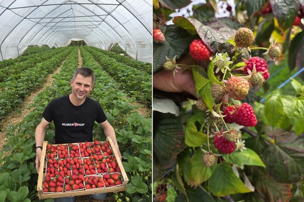 Jörg Huber in the strawberry tunnel: Starting in mid-May, he will also offer raspberries from his own farm (right).