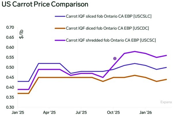 Despite the reduced supply, demand remains active across multiple formats. Industry sources indicate a strong interest in sliced carrot products, with buyers willing to accept California pricing premiums to secure volumes. Demand extends across applications, including snacking and meal preparation.