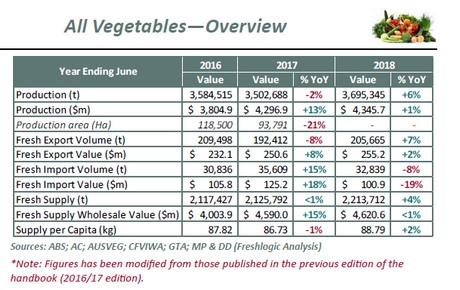 For the year ending June 2018, nearly 3.7 million tonnes of vegetables were produced (up 6 per cent on previous year) with a value of $4.35billion (one per cent increase). Overall vegetable exports increased by seven per cent to 205,665 tonnes, with a two per cent increase in value.