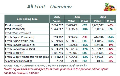 The value of both Australian fruit and vegetables has increased over the 2017-18 financial year, according to data from Hort Innovation's Australian Horticulture Statistics Handbook, released this month.