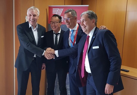 To a great cooperation (from left to right): Erich Staake, CEO of the duisport Group, David Liu, CEO of CSP Zeebrugge Terminal, Joachim Coens, CEO of Port of Zeebrugge, and Peter Plewa, Managing Director of duisport agency GmbH (dpa). Copyright duisport