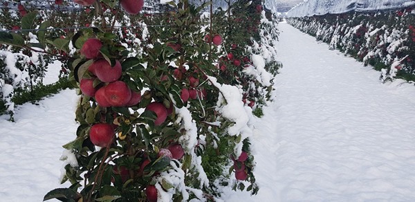 Snow fell while Crimson Snow apples were still on the trees. The orchards covered in snow with the Monviso in the background and the Alps all around created a calling card that has nothing to envy to the many products available on the market.