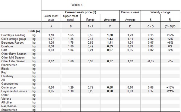 In this week's average wholesale market prices of home grown produce from the Department for Environment, Food & Rural Affairs the biggest increase for fruit was the price of Doyenne du Comice pears, increasing by 21%, from an average of £0.81 to £0.98 per kg.