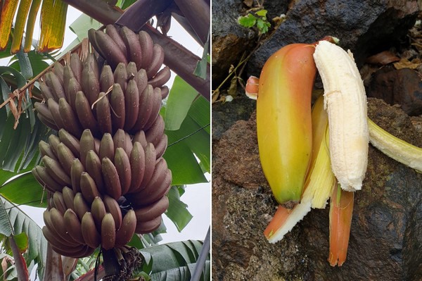 The color of red bananas lies somewhere between purple and brown. Their skin is thicker than that of yellow bananas. However, the fruit is smaller and it's color lies between yellow and pale pink. Its most surprising attribute is its sweet and light taste that reminds people a lot of raspberries.