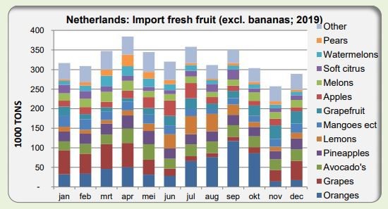 In order of importance, it is South Africa, (0,65 mln tons), Costa Rica (0,35), Brazil (0,32), Peru (0,31), Chile (0,24), Egypt (0,15), Morocco (0,11), and China (0,09). With 170,000 tons, Dutch non-EU fresh fruit import is at its lowest in November. This volume fluctuates between 200,000 tons in June and December and 300,000 tons in April.