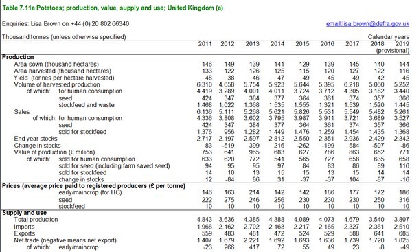 The United Kingdom Government has releases the statistics for agriculture. Some interesting information can be found in this report, like the yearly production of potatoes and several fresh fruits and vegetables, but also the supply in terms of imports and exports and prices per ton.