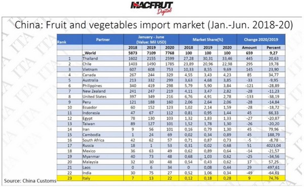 In the first six months of 2020, China’s imports of Italian fruit and vegetables increased by 74%, while last year a 20% increase was recorded. However, it is also true that Italy accounts for 1% of exports to China. These numbers emerged from the China-Europe debate that kicked off the second day of Macfrut Digital (9 September).
