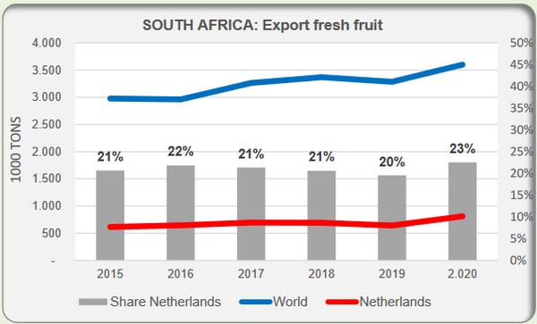There are considerable differences in South African export developments to its various buyers. The Netherlands has traditionally been the most important buyer of South African fruit. This year, almost a quarter more fresh fruit was exported to the Netherlands than in 2019. That's according to the South African Revenue Service (SARS). That's an increase of 17% compared to the previous two years. Eurostat's Dutch import figures confirm this.