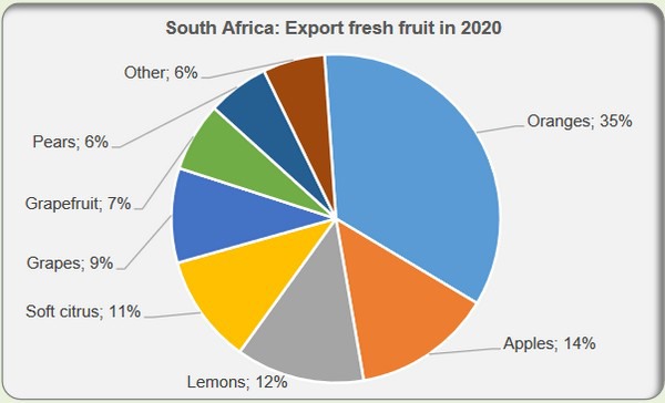 Lagging far behind in second place for exported products is apples. This year, South Africa's apple exports grew by eight percent to just under 500,000 tons. This year's top climbers in the South African export range are lemons and mandarins. Thirty percent more of both products were exported than in 2019. The Netherlands, again, took far more lemons. Exports to that country doubled from 45,000 tons in 2019 to more than 90,000 tons this year.