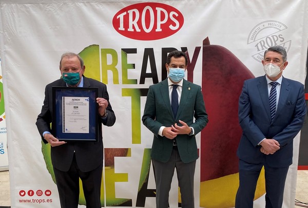 The certificate was presented to the president of TROPS, José Lorca, by the President of the Government of Andalusia, Juanma Moreno, and the AENOR director for Andalusia, Antonio Pérez.