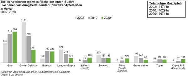 The apple has always been the most popular fruit in Switzerland. Per capita consumption for dessert apples was 14.66 kg between 2000 and 2002 and 13.9 kg in 2020. It was thus ahead of bananas and far ahead of other domestic fruits. What has changed, however, is the importance of individual apple varieties. Whereas in 2002 Golden Delicious had by far the largest acreage, the Gala is the most widely grown apple variety in 2020.