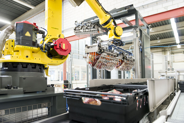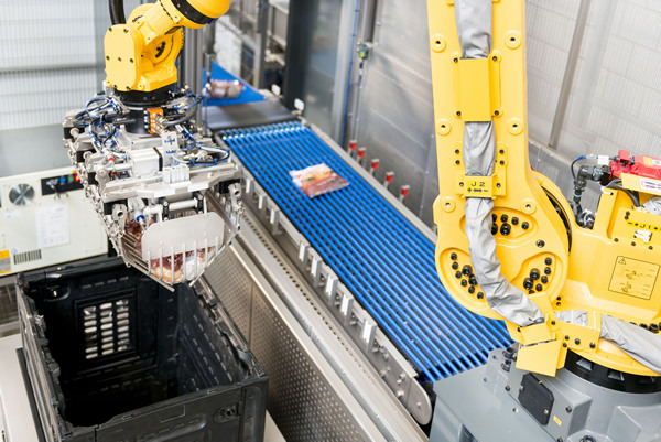 With a capacity of 70-100 products per minute, the fully automatic solution ensures that bags or nets from the pick-up table are placed in a crate or dolly. The dolly / crate loader has a dolly dock and crate transport conveyor available at less than 18 m2 parallel to the pick-up table. Switching to crates is done at the touch of a button. Do you need a different gripper for loading? The robot arm can change the gripper fully automatically in less than two minutes.