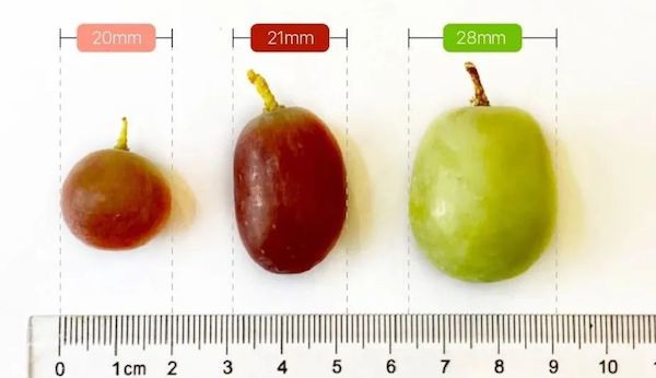 The Chilean Muscat Beauty grape is a relatively small mini grape of the seedless variety. The grapes are around 20mm in diameter. The Muscat Beauty grapes enter the market around the same time as the Australian seedless Crimson grapes, which have a diameter of 21mm. The Peruvian green Sweet Globe grapes have a diameter of 28mm. In addition, the Muscat Beauty grape is a round grape, whereas most grapes are oval. That is why the Muscat Beauty grape looks even smaller than other grape varieties.