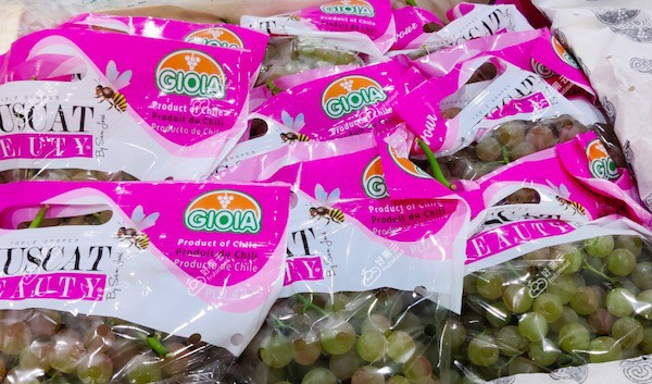 Chilean Muscat Beauty grapes, Australian Crimson grapes, and Peruvian Sweet Globe grapes
