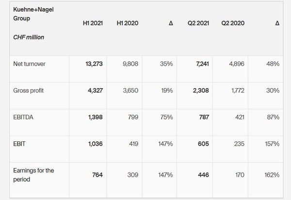 The continued recovery of the global economy led to strong demand for logistics services in the first half of 2021. In this environment, the Kuehne+Nagel Group delivered an outstanding financial performance; all business units were able to significantly exceed prior year earnings. At CHF 13.3 billion, the Group's net turnover for the first six months of 2021 was 35% higher than in the same period of last year while EBIT more than doubled to CHF 1.0 billion.