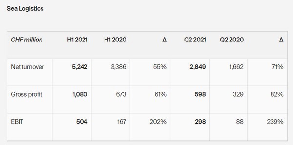At 2.2 million TEU, container volumes in the first half of 2021 were up 3% on the same period last year. The unit’s net turnover was CHF 5.2 billion and EBIT CHF 504 million. The conversion rate again reached a new record level of 46.7%.