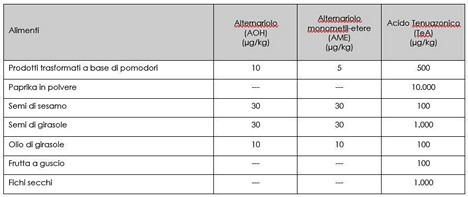 It should be pointed out that the values in the table do not coincide with safety levels. In addition, there is an explicit request in the recommendations to perform representative sampling according to specific regulations and to use more sensitive analytical methods. For the determination of alternariol and alternariol monomethyl ether, the limit of quantification should not exceed 2 μg/kg in cereal-based foods for infants and young children and 4 μg/kg in other foods; while for the determination of tenuazonic acid, the limit of quantification should not exceed 20 μg/kg in all foods.