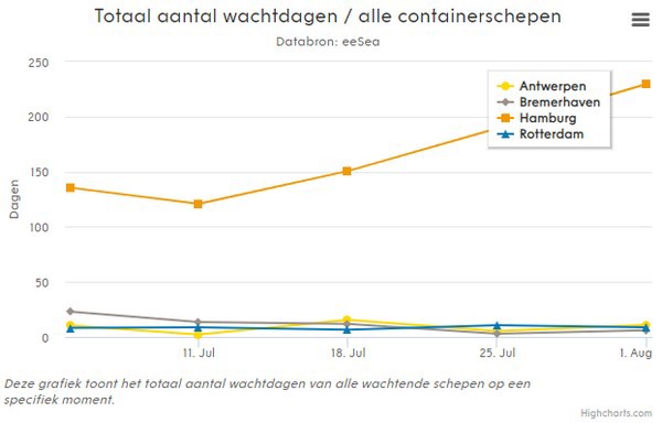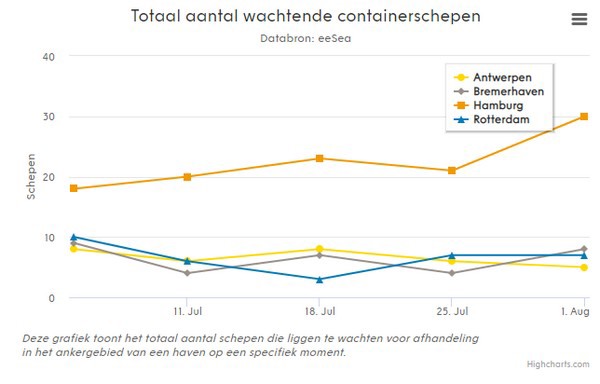 On the Port Performance page opened by the Port of Rotterdam Authority (HbR), users can view the waiting times for container ships in Rotterdam, Hamburg, Bremerhaven and Antwerp. The graphs are based on AIS data from eeSea and are updated every Monday.
