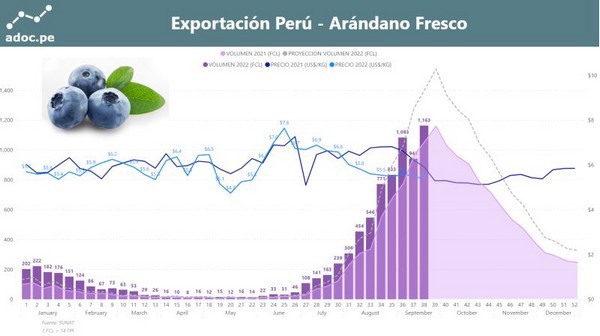 Adoc's chart showing the volumes and dollar value of Peru's blueberry exports op to end September 2022