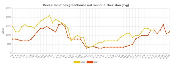 In early November, EastFruit wrote about record-high prices for tomatoes in Uzbekistan. As of November 4, 2022, tomato prices were at the highest level, and wholesale prices were 61% higher than in neighboring Tajikistan and 1.5 times higher than in Georgia and Moldova. What’s more, the difference between the prices for tomatoes in Uzbekistan and in the Russian market, which is the main market for fresh Uzbek tomatoes, disappeared at that time.