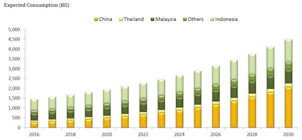 China is expected to rank 1st place by 2030 in terms of durian consumption
