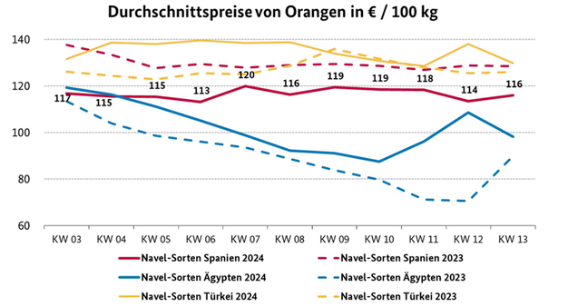 Even as the season draws to a close, extensive offerings remain available, according to BLE. Spanish products continue to dominate the market. The presence of Egyptian Valencia Late and Salustiana oranges held firm, while Turkish Navel varieties saw a slight decrease. The Spanish supply of oranges shifted increasingly from Navelate to the late-season Lane Late variety. As the season progressed, demand began to wane, and with the slowing of goods turnover, pricing for both Egyptian and Spanish stocks had to be handled more flexibly here and there.