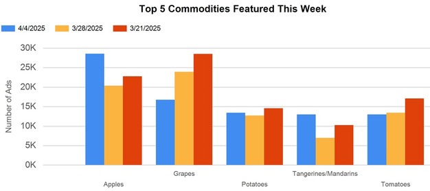 In terms of price changes for heavily advertised items (3,000 or more ads), the only significant increase for fruit was for cantaloupes, which rose 12% compared to the same week last year. Notable price decreases included white seedless grapes, down 30%; red seedless grapes, down 12%; Navel oranges (per pound), down 14%; and yellow mangoes, down 10%. For onions and potatoes, the only significant change was a 10% decrease in the price of Russet potatoes (per pound). There were no notable price increases for vegetables, but long seedless cucumbers saw a 20% decrease.