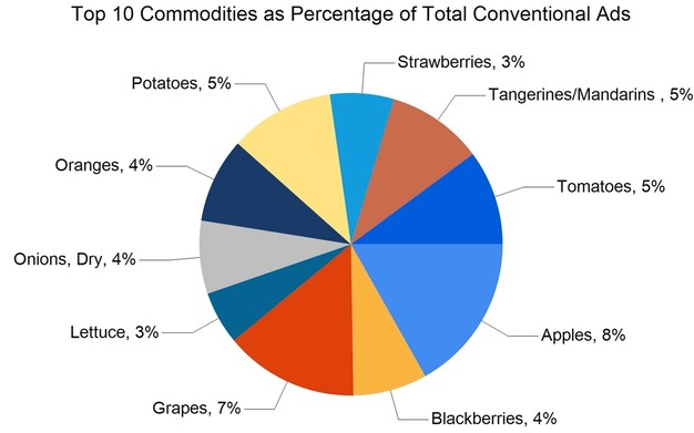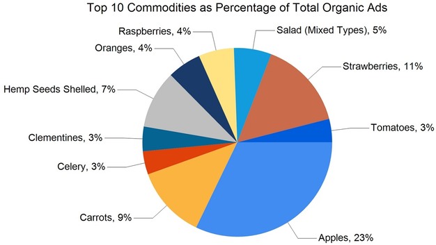 Total ad numbers reached 284,354, a 1% increase from last week's total of 282,595. Compared to the same week last year, this represents a 2% increase over the total of 277,695. Of these ads, 55% were for fruit (155,313), 35% for vegetables (99,701), and 8% for onions and potatoes (23,168). Smaller ad volumes included 952 for herbs, 985 for ornamentals, and 5,187 for hemp. Organic produce made up 13% of all ads, with 38,367 ads promoting organic items.