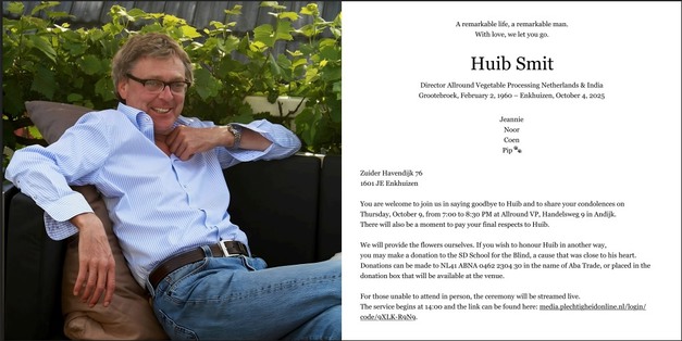 On Saturday, 4 October, Huib Smit, director of Allround Vegetable Processing in the Netherlands and India, passed away. Huib had been ill for some time. He was 65 years old.
