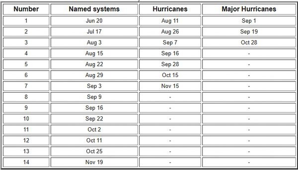The table below shows the 30-year average Atlantic hurricane season development.