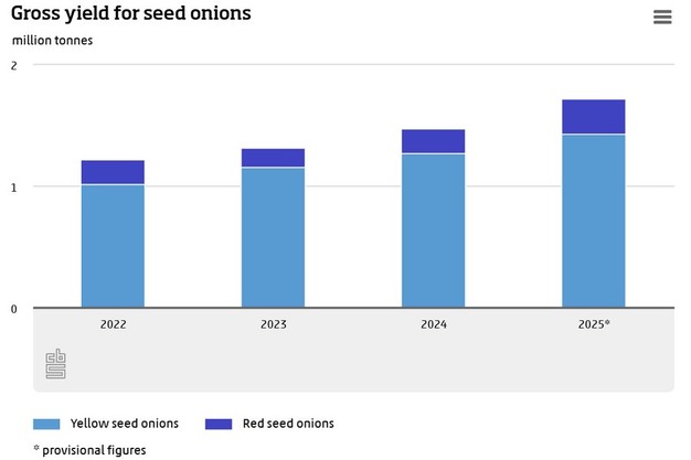 Seed onion production also increased, with total gross yields estimated at 1.7 million tons—17% higher than in 2024. The cultivation area grew by around 4%, while average yields per hectare rose 11% to 52.1 tons. CBS notes that favourable weather conditions, including many hours of sunshine, contributed to the higher yields, though the quality of some crops may be affected by soil diseases, leading to potential losses.