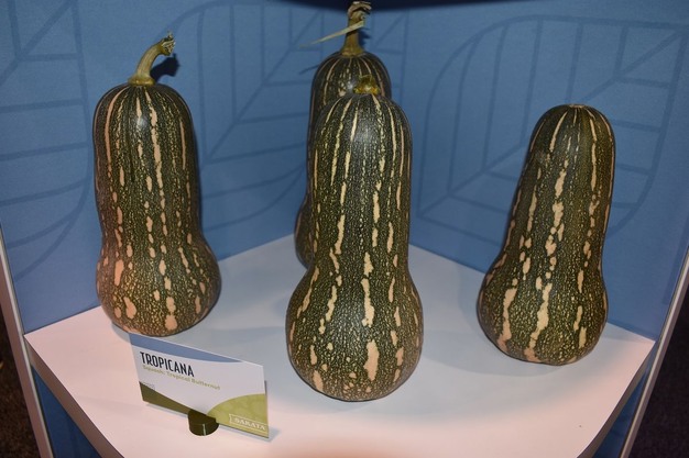 Tropicana is a new tropical butternut squash variety that is currently mainly grown in South America and South Africa, but Sakata Seed is working on getting the variety to the U.S. market. The hybrid variety is marketed for its vigorous growth and sweeter flavor as it has a higher brix level compared to other butternut squash varieties. Tropicana has dark orange flesh and a dark green skin that retains color in storage. "The variety is already commercially available in South America and South Africa, but we're trialing it in the U.S. currently and hope for it to be commercially available in 2027," Watkins said.