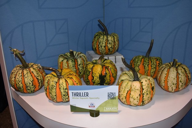 At IFPA's Global Show in Anaheim, Sakata Seed America showed several new squash and pumpkin varieties. "One of the varieties we're very excited about is Thriller," says Jeff Watkins, Cucurbit Business Unit Lead at Sakata. "It's a dual-purpose edible squash and a decorative pumpkin at the same time." The variety is a new All-America Selections (AAS) winner and according to AAS judges, the eating quality is far improved compared to similar types. The variable orange and dark green psychedelic stripes on a creamy background create consumer appeal. The colors appear early and hold well after harvest. Thriller will be commercially available in 2026.