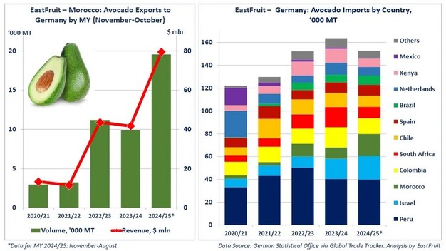Morocco has increased its presence in the German avocado market, more than doubling export volumes during the 2024/25 season, according to EastFruit data.