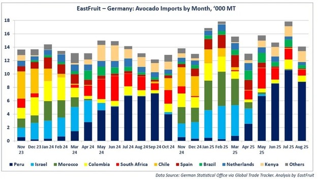Peru remains the primary supplier of avocados to Germany, dominating shipments between May and October, while South Africa competes strongly in the same period. Chile provides the main supply from November to December, while Israel, Colombia, and Morocco primarily cover demand from January through March.
