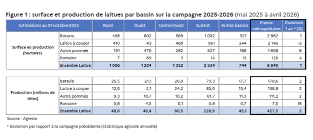 For the 2025-2026 season, national acreage is expected to increase slightly (+1%) from the previous season, to 6,840 hectares. However, this overall increase masks a downturn in the northern basin, where acreage is expected to decrease by 3%. According to estimates on October 1st, 2025, national production will reach 427.5 million heads, a 2% increase from last year, driven mainly by an increase in the Northern Basin.