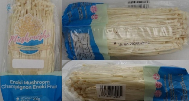 The recalled product is a 200 g package of Enoki Mushroom sold under the Mushmoshi brand, with UPC 6 931787 400001 and lot code 16/02/2026[G]042. Distribution is limited to British Columbia.
