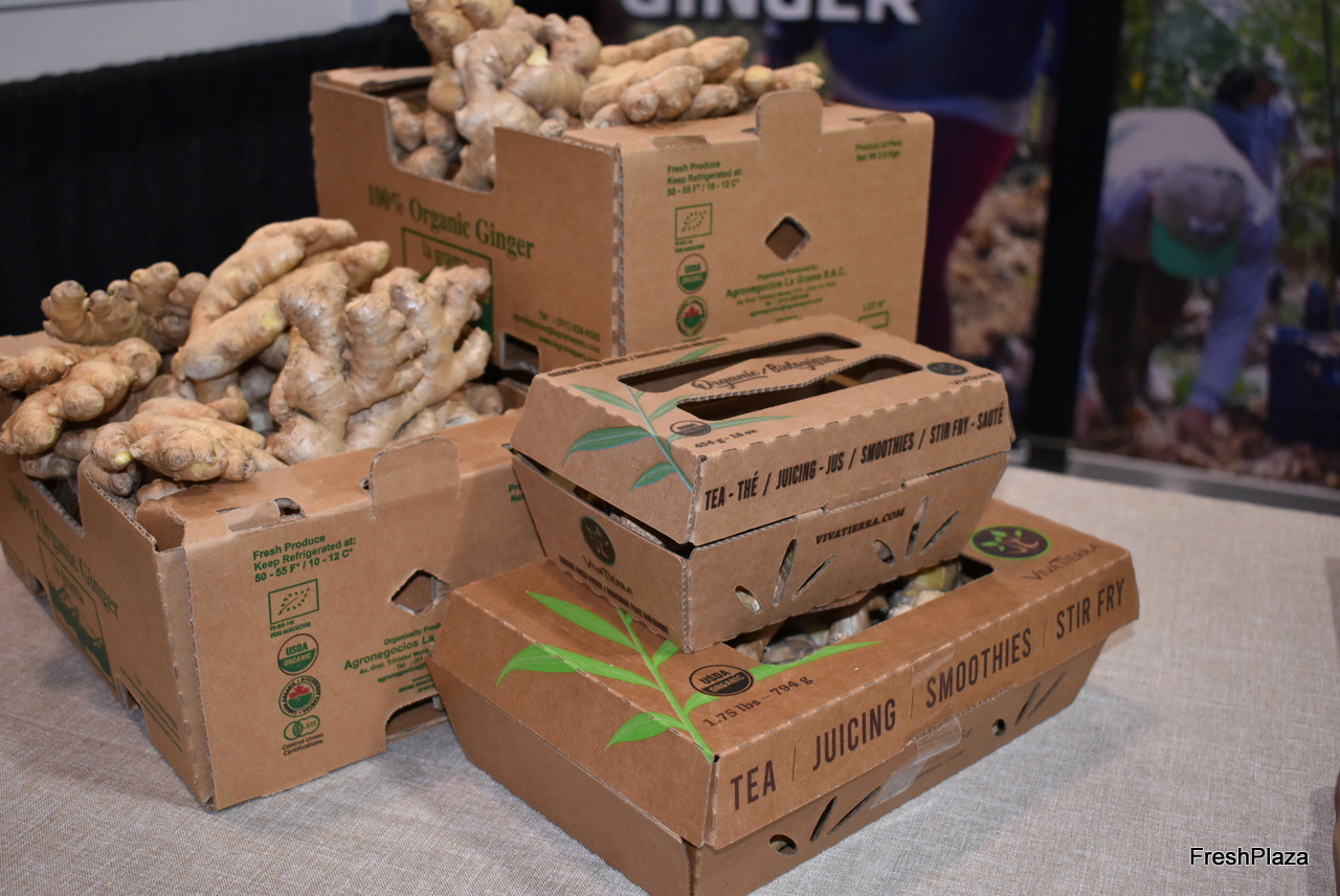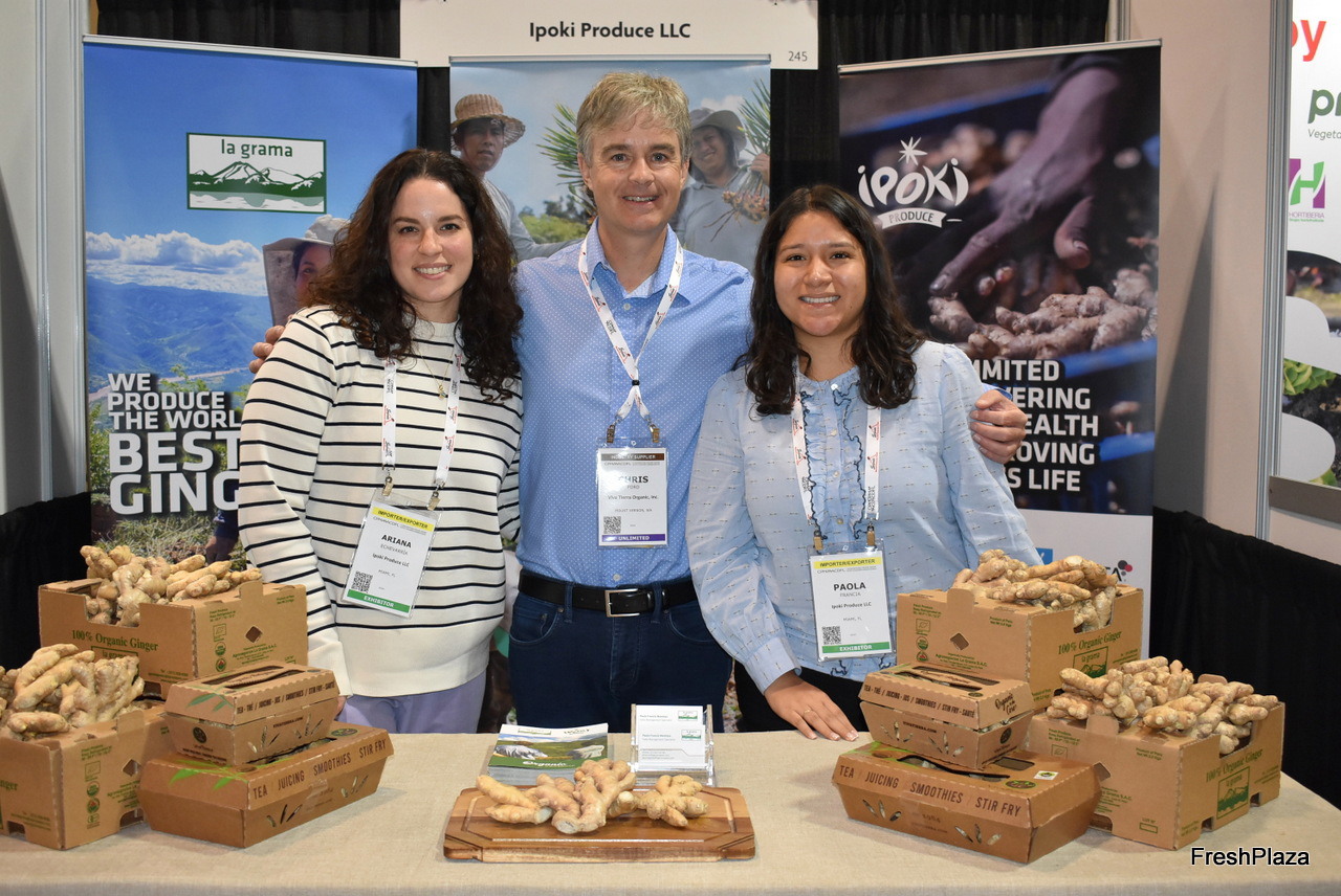 Chris Ford of Viva Tierra is flanked by Ariana Echevarria Fiol and Paola Francia Montoya with la grama. The company offers organic ginger from Peru.