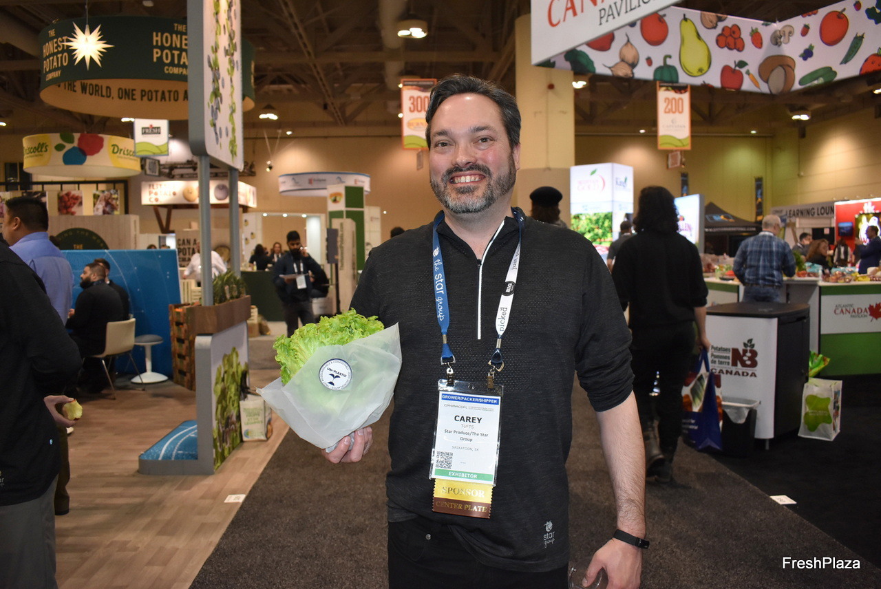 Carey Tufts with Star Produce shows lettuce in a sleeve that's backyard compostable and doesn't leave micro plastics behind. The company has been working with CTK Bio in British Columbia on sleeves and clamshells.