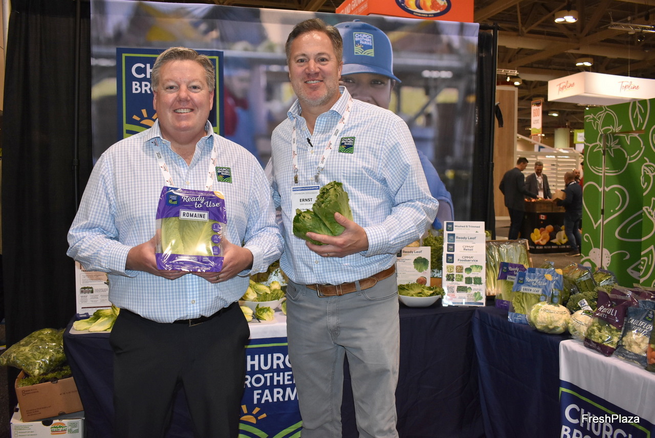 Brian Bengard and Ernst van Eeghen with Church Brothers Farms show whole leaf Romaine and Tuscan Baby Romaine lettuce.