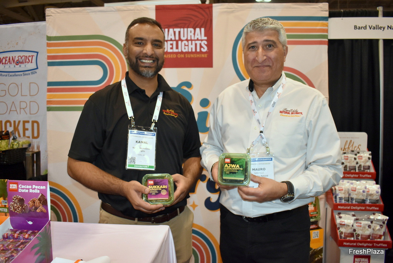 Kamal Zeewari and Mauro Santelli with Natural Delights proudly show two new date varieties; Sukkari and Ajwa.