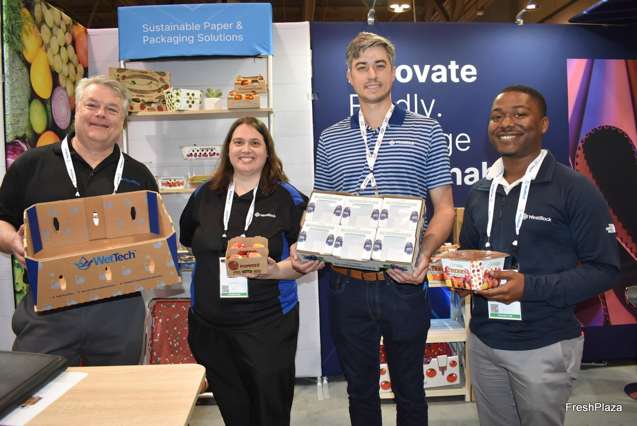Team WestRock shows different types of packaging. From left to right: Michael McLeod showing WetTech corrugated, Kimberly Wetter showing a carton apple carrier, Andrew Freeman shows carton primary package and corrugated master shipper and Jaylen Ponder shows a topseal tomato punnet.