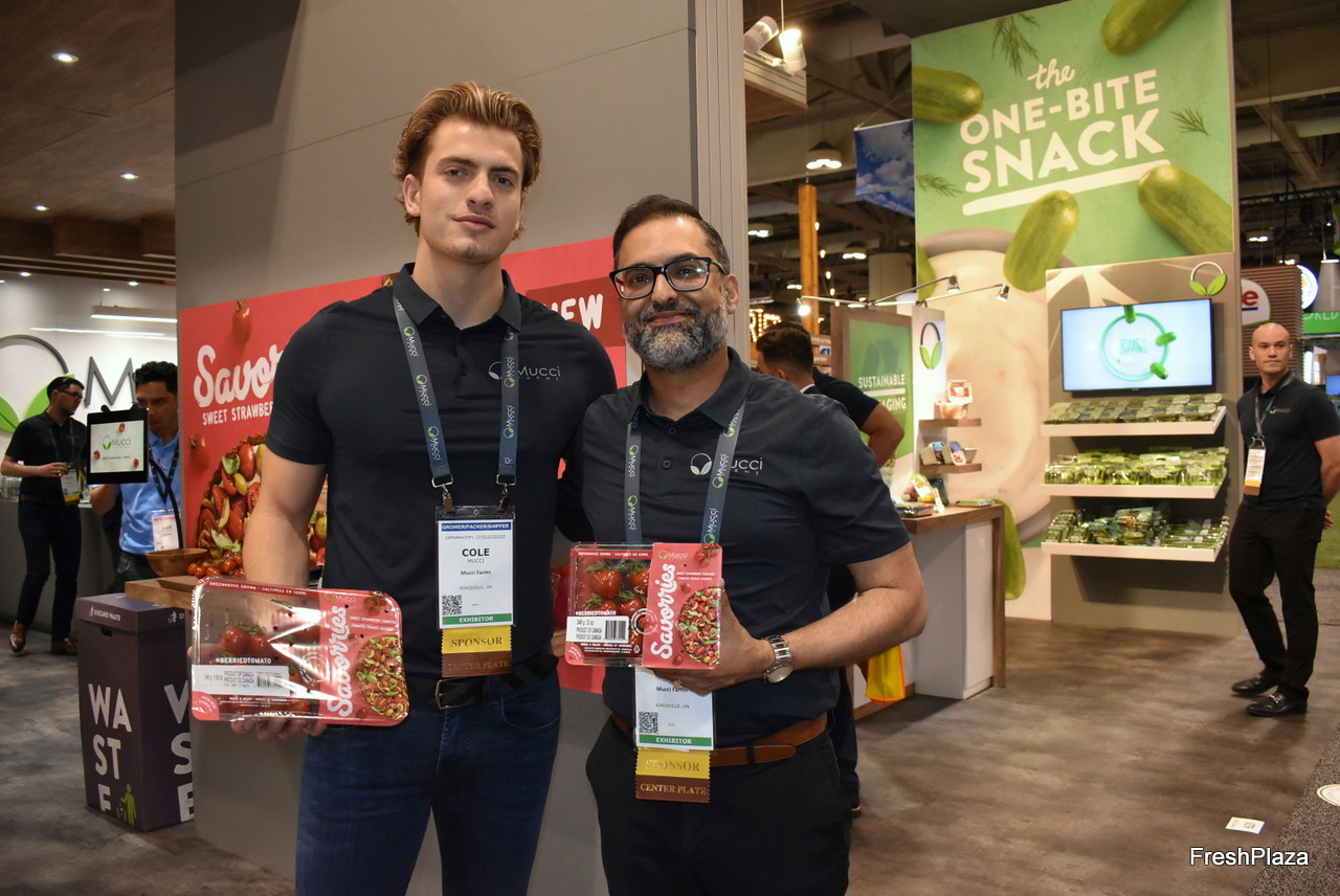 Cole Mucci and Ajit Saxena with Mucci Farms proudly show different packaging options of Savorries Strawberry Tomatoes, the company's latest product introduction.