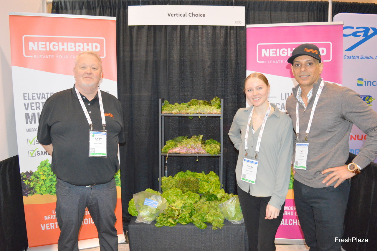 Vertical Choice Andy Eustis, Jessica Olmstead and Jay Kallu grow leafy greens in a greenhouse and happy to be at the show to display their produce.